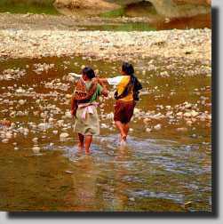 Early on the following morning, having explored the bay and taken photographs in the rice fields at Pacitan, we headed north in the direction of Ponorogo. The first third of the journey was spent winding alongside the river Grindulu, where we were tempted to make frequent stops. At one point we climbed down the river bank to admire some gigantic boulders, which at some time in the distant past must have rolled down the surrounding hillsides. On another occasion we attempted to cross the river by way of an ancient swaying tension bridge.