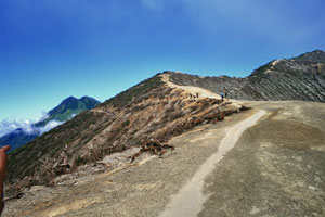 After photographing the changing colours of the early morning sky, from deep purple/blue/gray to golden yellow, we focused on the mountain peaks. Raung, Pendil, Suket and, far to the west, the faint outline of Mt Argopura and the Iyang plateau, lay like so many islands floating on a sea of cloud. As the first rays of the sun lit up the peaks, we set off on the last stage of the journey, a 45 minute climb to the crater rim of ijen.