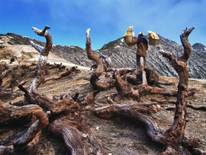 The sulphur, we learned, is transported entirely on foot. In the past, horses were used but they were found to be less practical on the hazardous terrain. Today, the mine yields nine to twelve tons of sulphur per day. Individual loads of up to 70 kgs are carried by men, often barefooted, up to the rim of the crater and then 17 km down the mountainside to a factory near Banyuwangi. The porters are paid by weight. After arrival at the factory, the sulphur is treated before being used in the production of medicines and as an important element in the processing of sugar.